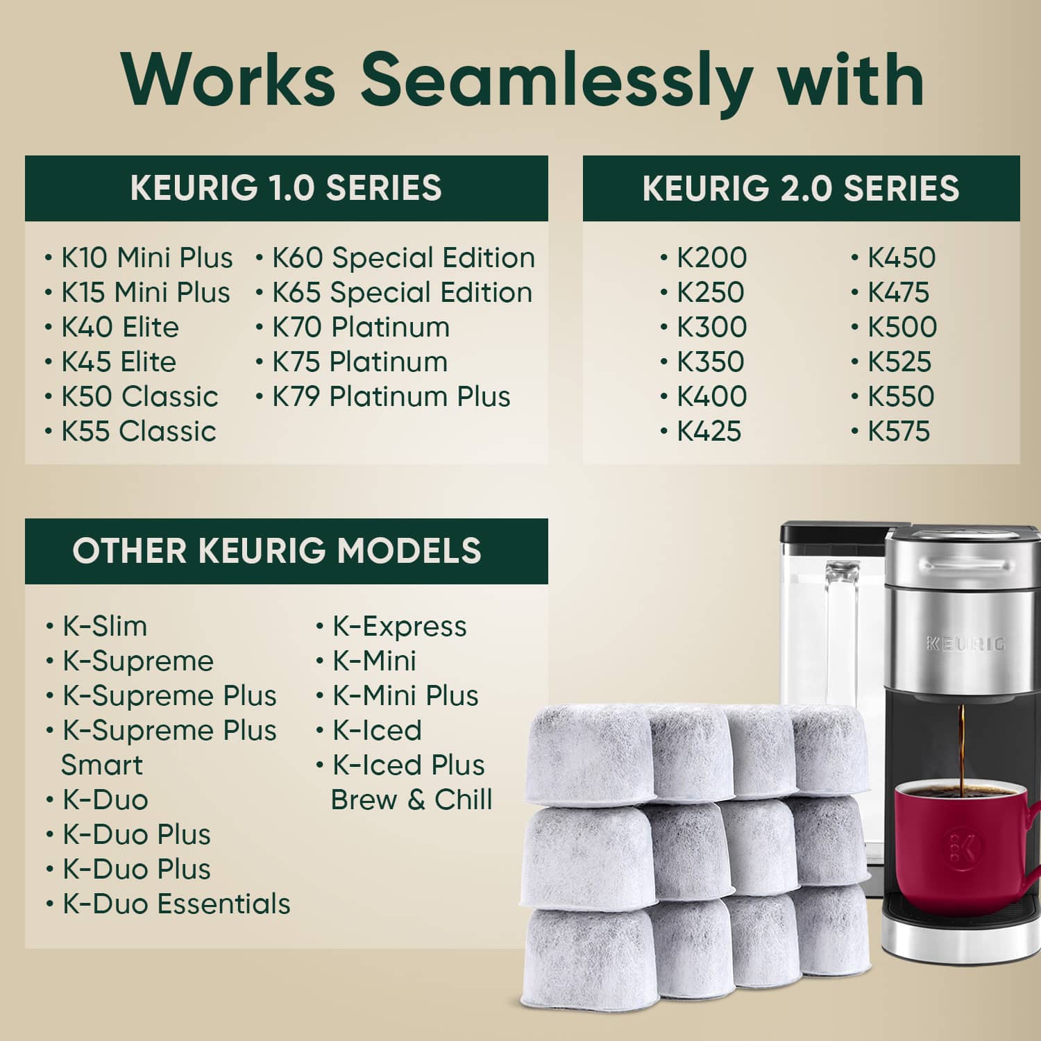 - UNIVERSAL FIT KEURIG AND BREVILLE – For use with all Keurig 1.0, Keurig 2.0 and Breville coffee machine. Including all older Keurig coffee makers manufactured after 2007: Keurig Single Cup Reservoir Brewing, Elite, Classic, Ultra, Special Edition, Ultimate, Platinum, K40, K45, K50, K55, K70, K200, K250, K400, K475, K575, BWF100 and more. (FULL LIST SEE BELOW) – NOTE: WILL NOT FIT CUISINART.